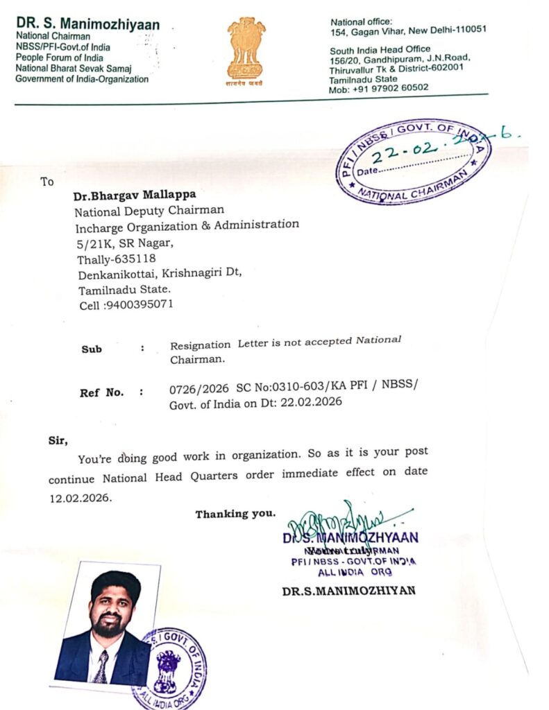 पीपुल्स फोरम ऑफ इंडिया में राष्ट्रीय उपाध्यक्ष के पद पर डॉ. भार्गव मल्लप्पा अपनी जिम्मेदारियां पूर्ववत निभाते रहेंगे। संगठन के राष्ट्रीय अध्यक्ष डॉ. एस. मणिमोझियान ने उनका इस्तीफा औपचारिक रूप से अस्वीकार करते हुए संगठन के सामाजिक मिशन, जनसेवा अभियानों तथा दीर्घकालिक दृष्टि को ध्यान में रखते हुए उनसे पद पर बने रहने का अनुरोध किया है।